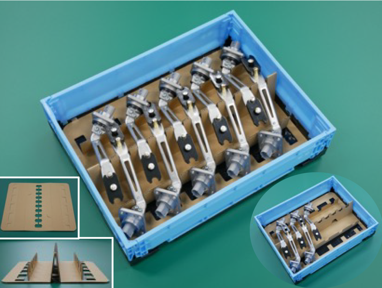 自動車業界では、物流容器としてリターナブルBoxに段ボール製仕切などの資材を投入して製品を収納し、海外輸送を行う方式が多く採用されている。
