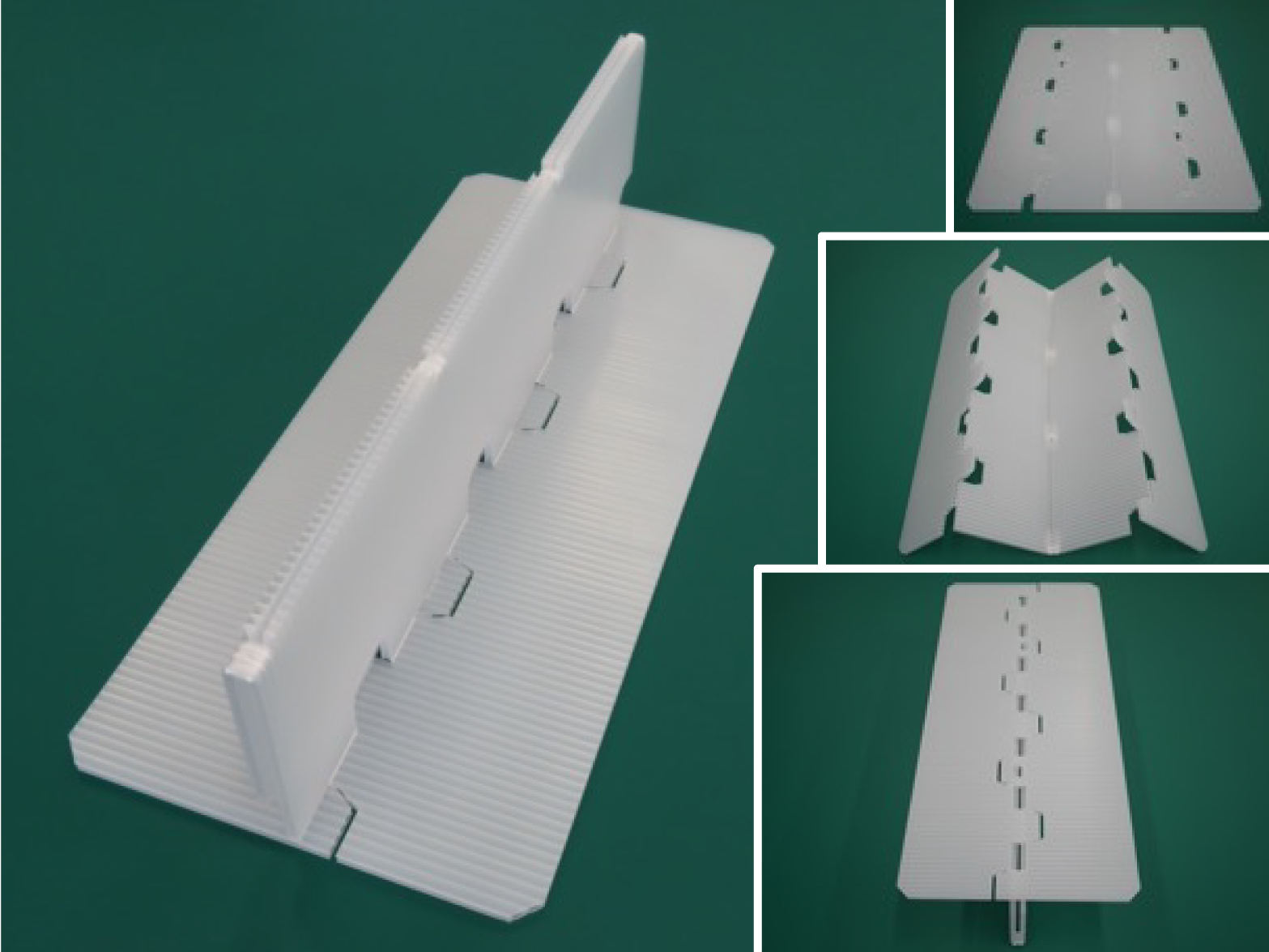 自動車業界では、物流容器としてプラスチック段ボールを素材とした仕切が多く使われている。主な用途は、工場間輸送中に、リターナブル容器内の製品同士の接触を防ぐためで、底PAD 付きの仕切(以後、倒立PAD)が使われていた。しかし倒立PAD は構造上、製作に手間がかかるという課題があった。そこで、簡単にワンタッチ2秒で組立できる「T 型クロスロック」を開発した。これにより製作時間を1/4(プレス抜きのみ)に短縮し、約40%のコスト削減を実現した。