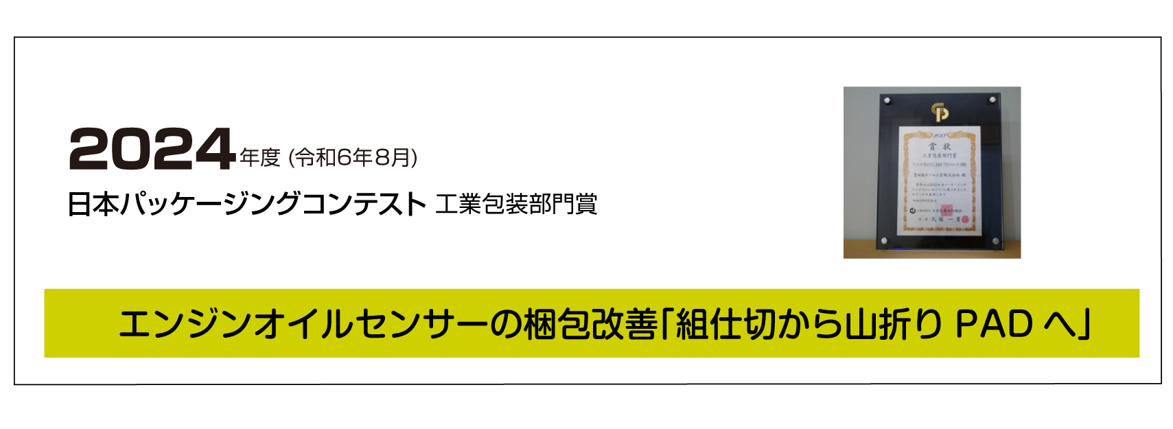 自動車のガソリンタンクについては、個装包装にてワンウェイで輸送する方法が多く採用されている。従来は、製品の周囲を段ボールの組立緩衝部材で押えて固定する方法が多く、形状に合わせて4~6ヶ所のロの字型緩衝部材を有する一体式段ボール組立PADを用いるが、その組立工数と材料歩留まりが課題となっていた。特に組立工数については、製品生産の繁忙時にも対応できるような、シンプルかつ簡易に組立可能なPADが必要とされていた。そこで、製品の固定方法を見直し、曲げ回数が少ない形状で製品をしっかり固定できる、「三角ガイドフィットPAD」を開発。結果、従来よりも組立工数を67%削減、材料使用量を45%削減できた。