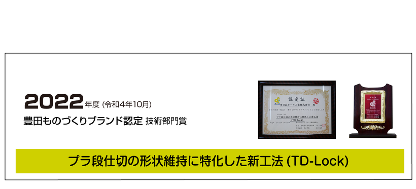 弊社は自動車部品物流容器に特化しており、 段ボールなどの紙系のワンウェイ容器とプラ段などの樹脂系のリターナブル容器を生産しております。 今回はプラ段仕切を使用時に「仕切の部材が抜ける=組み直す工数の発生や、紛失により再購入する」 というお困り事に、 弊社は機械やテープを使用せずプラ段仕切を簡単に固定できる新工法「TD-Lock」シリーズを開発いたしました。
