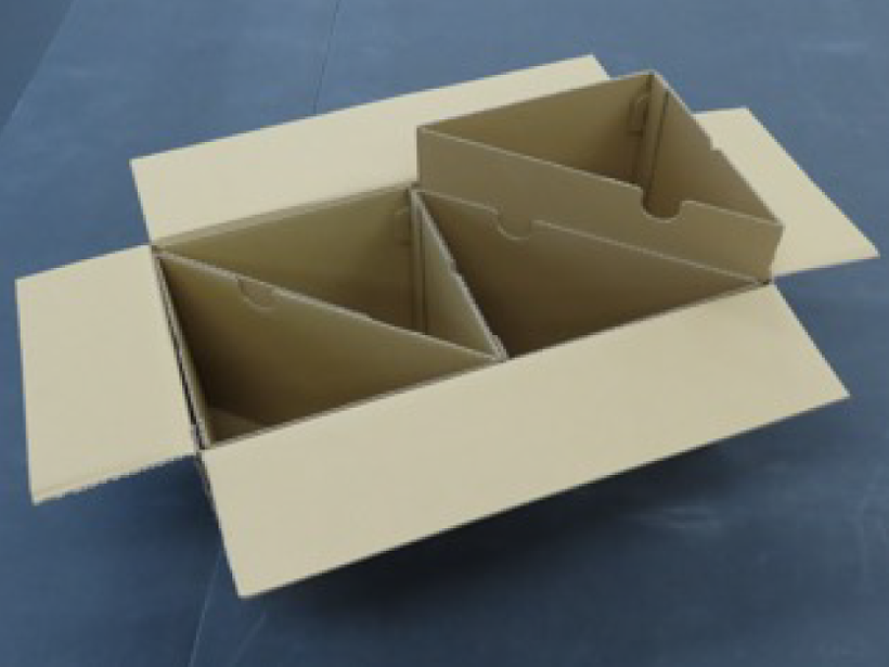平板からワンタッチでケース状にでき、ワンタッチで展開可能な三角形のヤッコで、主に内装箱として使用する。全体の荷姿は、複数の三角マスの仕切構造となり、容器内で安定しにくい異形部品、および段積み品等の収納に有効である。